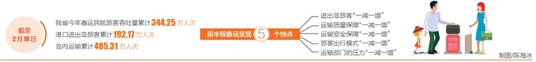 据分析,我省前半程春运主要有以下五个特点。一是进出岛旅客“一减一增”:表现在水路进出岛旅客小幅减少,民航进出岛旅客有所增加。二是运输质量保障“一减一增”:针对运输服务的投诉大幅减少,社会各界对我省运输服务质量提升的获得感明显增加。三是运输安全保障“一减一增”:各类重大安全隐患大幅减少,安全保障的可靠度明显提升。四是旅客出行模式“一减一增”:旅客到站买票行为明显减少,采用预约出行模式的旅客大幅增加。五是运输部门的压力“一减一增”:今年春运组织采取强化协同模式、重在事前预防,春运开始后各部门和运输企业的事中事后应急工作压力与往年相比明显减少,节前的准备工作量明显增加。