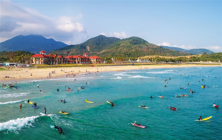 2月9日,万宁日月湾,游客在海中冲浪,享受欢乐时光。