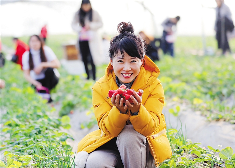 2月8日,市民在衡水市高新区一生态农场展示采摘的草莓。
