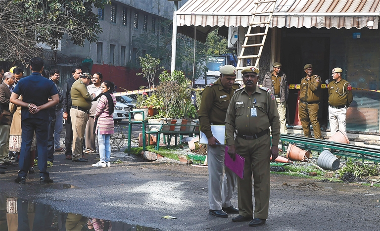 2月12日,在印度首都新德里,警察在火灾现场警戒。