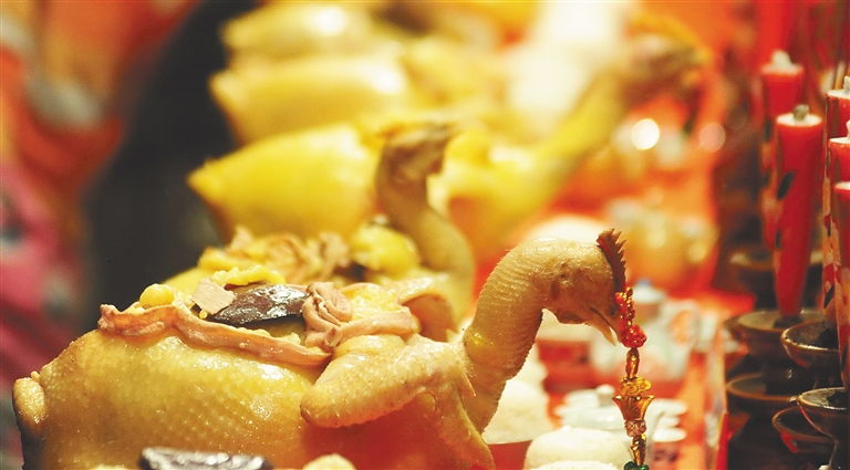 “闹元宵活动通常从中午合家吃完元宵饭开始,有时主人家还会邀请在当地过年的外地客人来家中共享。”定安县定城镇莫村社区居民莫非说,一桌完美的元宵饭,不仅有白斩鸡、斋菜煲等佳肴,海南粉更是必不可少。当天,全家人都要早起为此做准备,所有人忙前忙后,洗菜、拔鸡毛、剁生姜,砧板上清脆的剁肉声响个不停。吃完这顿饭,长辈们便要备好香火和贡品,领着一家人前往祠堂祭祖。