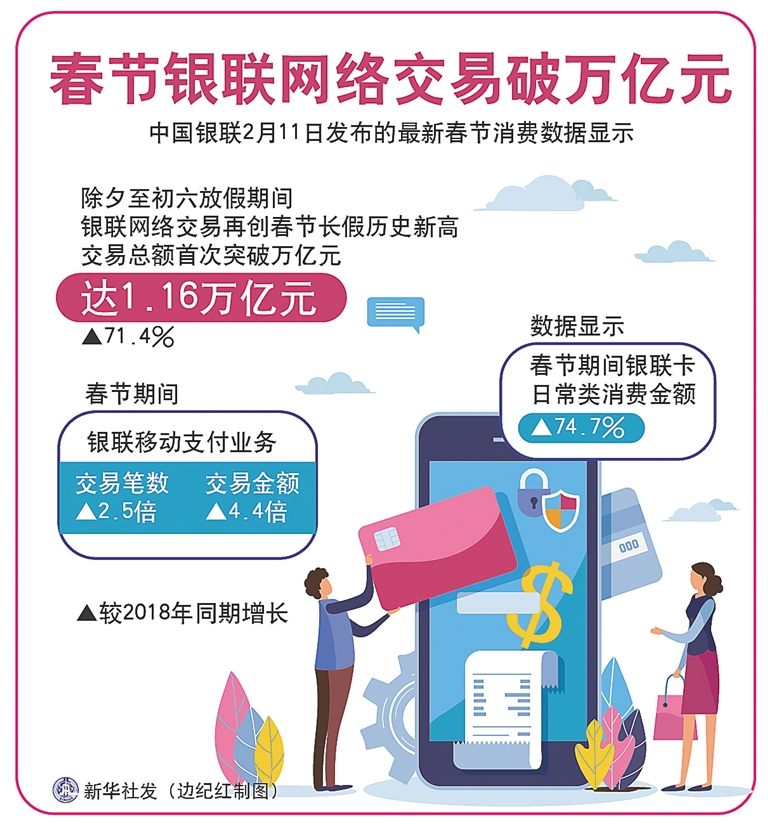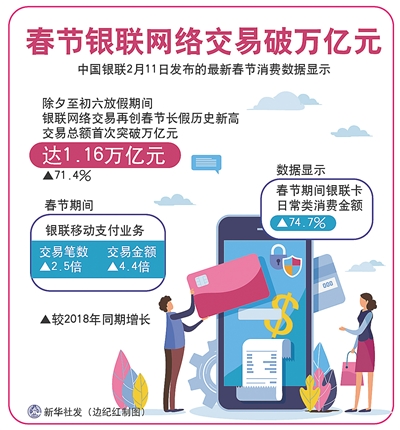 此外,有越来越多境外持卡人赴中国体验年味。随着银联卡境外发行突破1亿张,春节期间37个境外市场的持卡人在境内用卡,交易金额同比增长超过2成。
