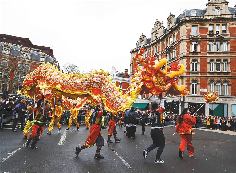 当晚,中国东方歌舞团带来的《亥猪乐道》为演出拉开序幕,身着大红服饰、拿着红灯笼的演员们随着悠扬的音乐跳起欢快动人的舞蹈,将红红火火的春节气息带给全场观众。