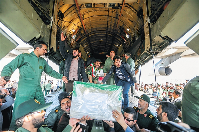 2月14日,在伊朗伊斯法罕机场,人们运送遇难者的棺木。