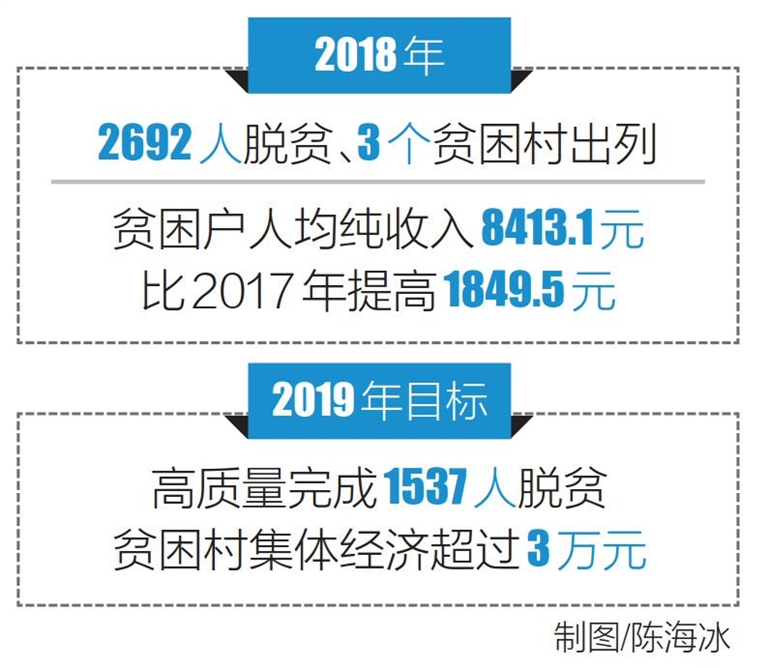 会议指出,2018年澄迈县完成了2692人脱贫、3个贫困村出列的目标任务;贫困户人均纯收入8413.1元,比2017年提高1849.5元,脱贫户人均纯收入8736.1元。