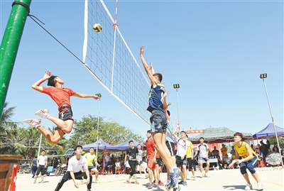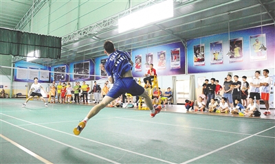 ②澄迈县“迎春杯”羽毛球赛中选手进行扣杀。本报记者 苏晓杰 通讯员 王家专 摄