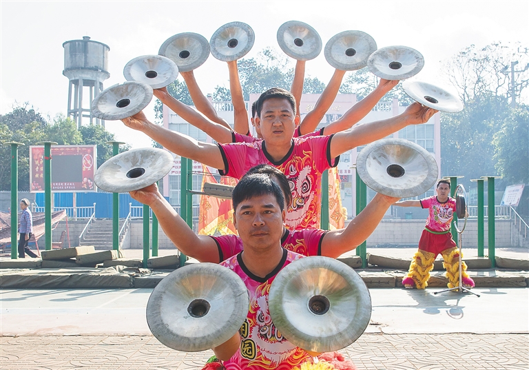 在当天的表演中,三角园精武龙狮团先后表演了醉狮、飞高桌、蹬高台、爬高杆、梅花桩及花样表演等项目,精彩的演出博得了在场观众的热烈掌声。
