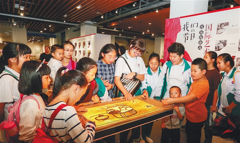 2月16日下午,“看见艺术的力量”——迎春人文艺术沙龙在海口市民游客中心多功能厅举办,众多艺术家、非遗传承人、音乐人汇聚一堂,共同展示艺术的美感和力量。图为观看展览的孩子们在体验沙画艺术。本报记者 袁琛 摄