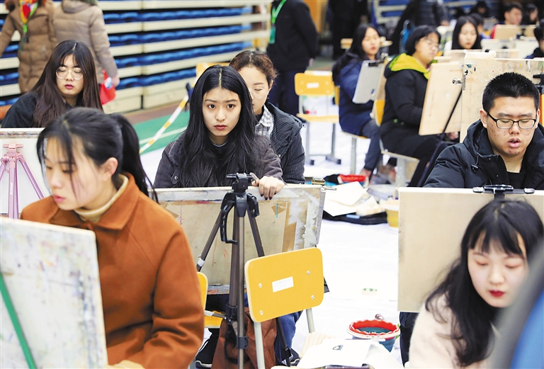 2月16日,北京电影学院2019年招生考试开始,近9500人参加首日考试。今年报考总人次59059人次,同比增长31%,再创历史新高。其中,美术学院报考人次同比增长150%,增幅最大。图为报考美术学院的考生在初试现场作画。新华社发