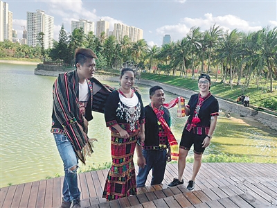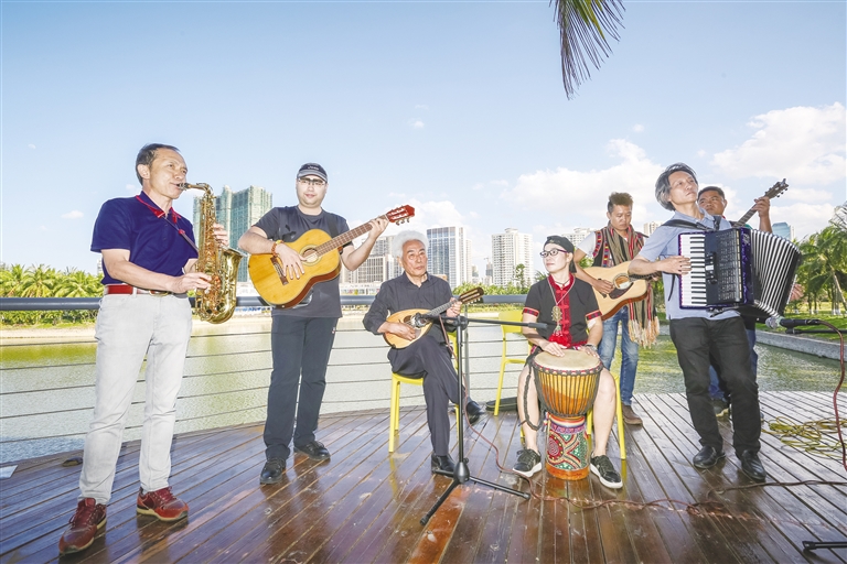 手风琴、吉他、曼陀铃(西洋乐器,源自意大利)、手鼓,与高音空灵的“欧欧调”中西合璧,交织辉映,在美丽的椰城世纪公园湾畔演绎着别样的深情。