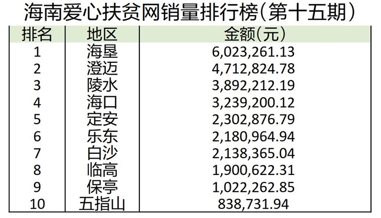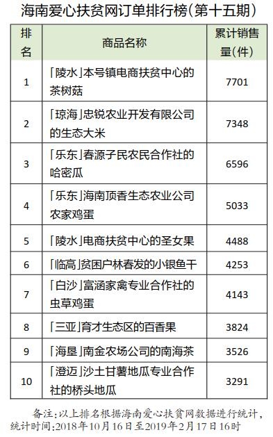 据了解,截至2月17日16时,海南爱心扶贫网线上销售额919.46万元,线下扫码支付销售额2201.12万元,线上线下销售额合计3120.59万元。本期榜单上,海垦、澄迈、陵水分别占据销量排行榜前三名;陵水本号镇电商扶贫中心的茶树菇、琼海忠锐农业开发公司的生态大米、乐东春源子民农民合作社的哈密瓜在订单排行榜上位列前三名。