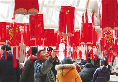 2月17日,市民在山东省潍坊市图书馆内猜灯谜。 新华社发(张驰 摄)