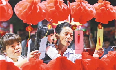 2月17日晚,元宵主题晚会拉开了陵水黎族自治县元宵喜乐会系列活动序幕。至2月20日接连4晚,陵水举办13项文体活动喜闹元宵。图为当地群众在元宵喜乐会上猜灯谜。 文/本报记者 李艳玫 图/本报记者 武威 通讯员 胡阳