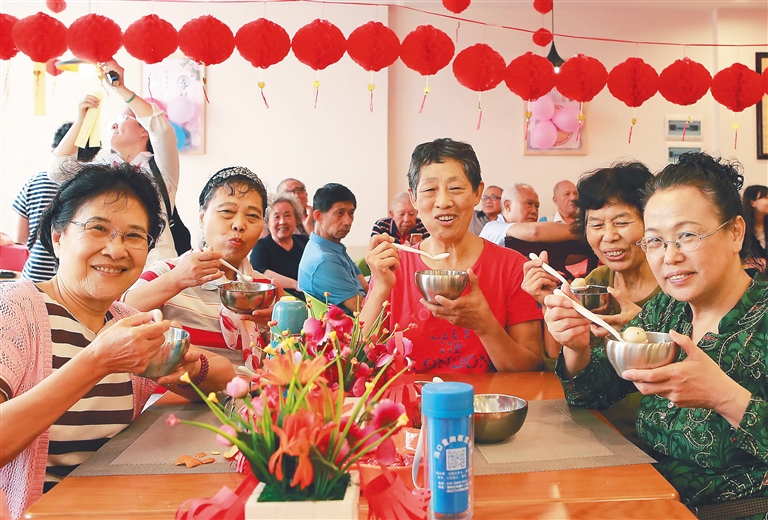 2月19日,海口15家长者饭堂同时举办闹元宵活动。图为美兰区海甸街道办新安社区长者饭堂内,老人欢聚一起吃汤圆。当天,海口长者饭堂供餐企业海口海南力合泰食品有限公司为老人送出大礼包,从3月1日起,在保证同等质量的情况下,供给长者饭堂的套餐价格由原来让利1元调整为让利3元,每份套餐价格为13元。