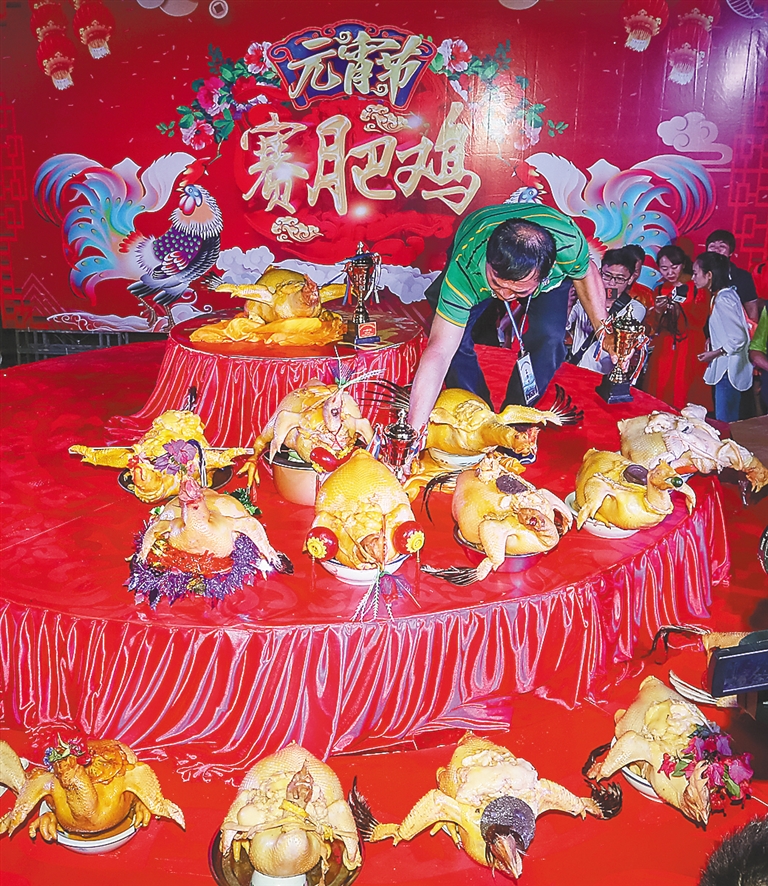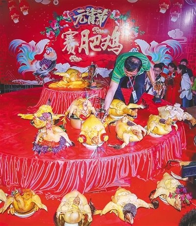 赛肥鸡由明代祭祀城隍爷的祭礼演变而来。在琼海市博鳌镇乐城村,每年正月十五、十六,家家户户将圆鼓鼓的肥鸡摆放在家门口。在百姓欣赏品评的同时,村里德高望重的乡贤则会挨家挨户为参赛的肥鸡评分,推选出一年一度的夺魁肥鸡。谁家的鸡最肥,说明谁家最会养鸡,同时也是最勤劳的象征。(丁平)