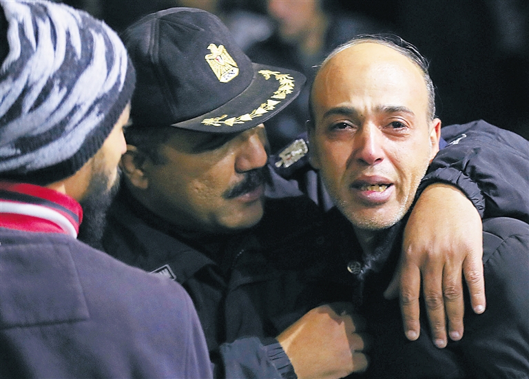 2月18日,在埃及开罗,人们在爆炸现场互相安慰。