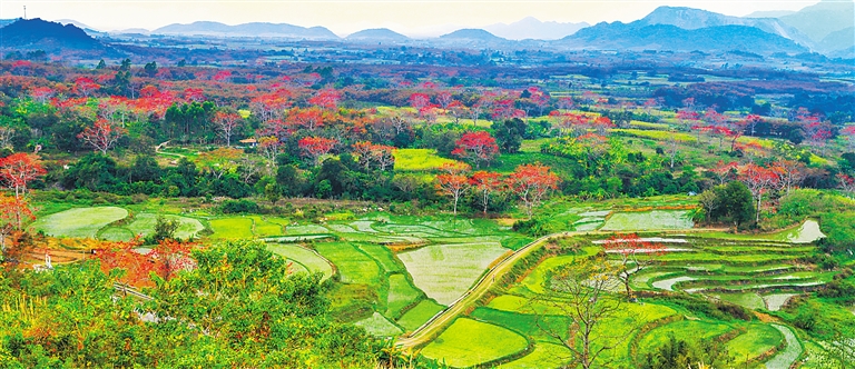 与昌化江畔赏花不同,在叉河镇的排岸村,盛开的木棉与水田形成了另一幅黎乡的春季风情画。