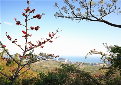 何来惊喜?或穿过一段树叶掩映下的“隧道”后,遇到几棵开得旺盛的木棉花;或一路欣赏绿树红花美景有些审美疲劳之时,看见蔚蓝的大海。