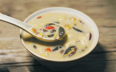 粿仔汤出炉,小尝一口,浓浓的糖水下肚后一阵温润,Q弹的粿仔中不仅可以尝出浓浓米香,还可品出山药、紫薯等食材的天然香味。