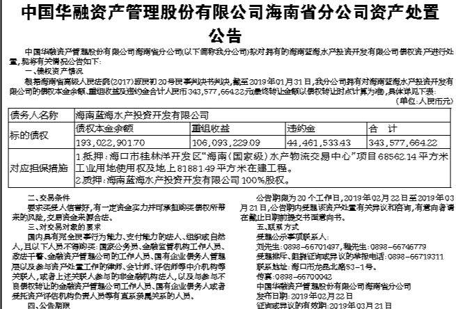 中国华融资产管理股份有限公司海南省分公司资产处置公告