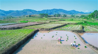 “舂锄扑扑趁春晴”。近日,位于白沙黎族自治县牙叉镇的白沙村,农民趁着好天时进行春耕,葱绿的田野、纵横的阡陌,构成一幅田园风景画。