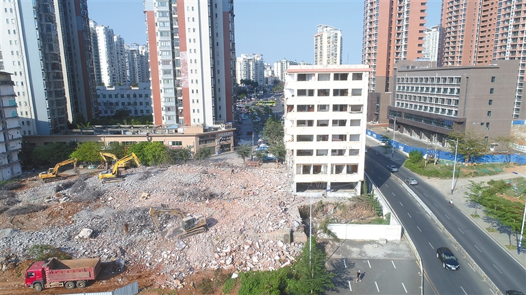 2月21日,高空航拍位于海口市琼山区道客路的一栋8层高的楼房,挖掘机正在清理拆除该楼的外围设施。据了解,2月24日,有关部门将正式拆除该楼楼体。