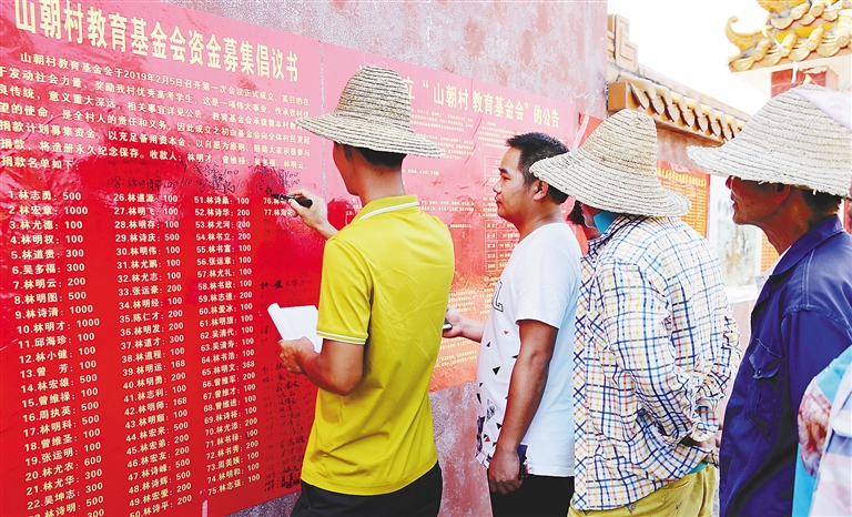 一张名为“山朝村教育基金资金募集倡议书”的鲜红告示贴在公庙外墙上,村民小组长林志勇认真地将捐款人名单抄写在公示榜上。