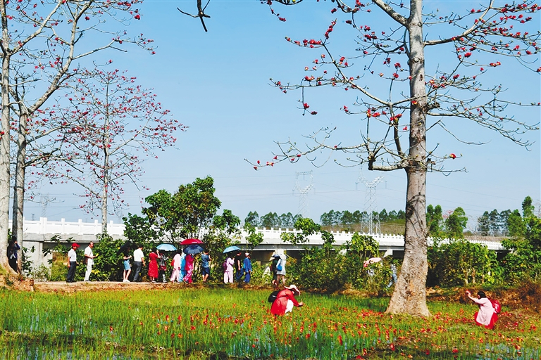 ① 2月23日,在昌江黎族自治县七叉镇,木棉花开得正艳丽,吸引诸多游客前来观赏。通讯员 邱瑞天 摄