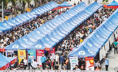 招聘会现场,不少企业摊点前排起了长队,岗位情况咨询、简历提交、现场面试、就业意向书签订等招聘环节有序进行。本报记者 袁琛 摄