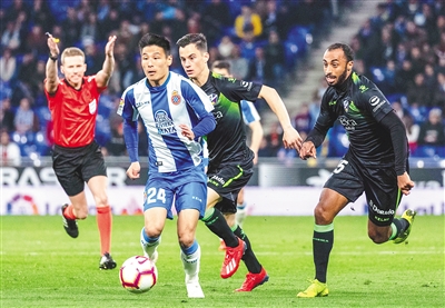 23日,在西甲联赛第25轮比赛中,西班牙人队主场以1∶1战平韦斯卡队。图为西班牙人队球员武磊(左二)在比赛中带球突破。新华社发