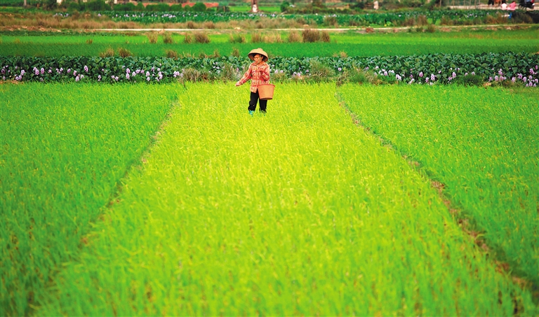 一眼望去,张遂吉家的田里,秧苗翠色欲滴,水田如斑驳的镜面,将午后斜斜的阳光折射出波光粼粼。张遂吉头戴笠帽,肩上挎着一桶化肥,赤着脚小心翼翼地探入水田中,生怕踩到了一株禾苗。他一面向前走,一面从桶中抓出一把化肥横洒入田中,犹如雨珠落入玉盘之中。