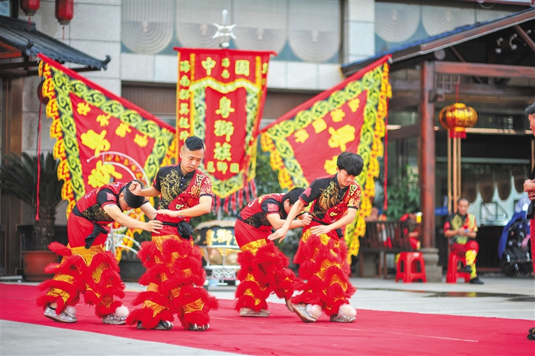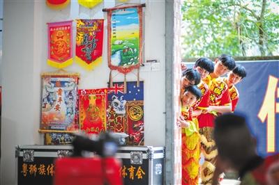 在明媚阳光中,粤狮族醒狮团的旗幡鼓足了劲在风中飘扬,敲鼓师傅眼神刚毅,敲击出阵阵振奋人心的鼓点。随着鼓乐节奏,两头醒狮威风凛凛,身手敏捷,时而搔头摆尾,时而仰视低顾,时而闪转腾挪,逗人喜爱,吸粉无数。