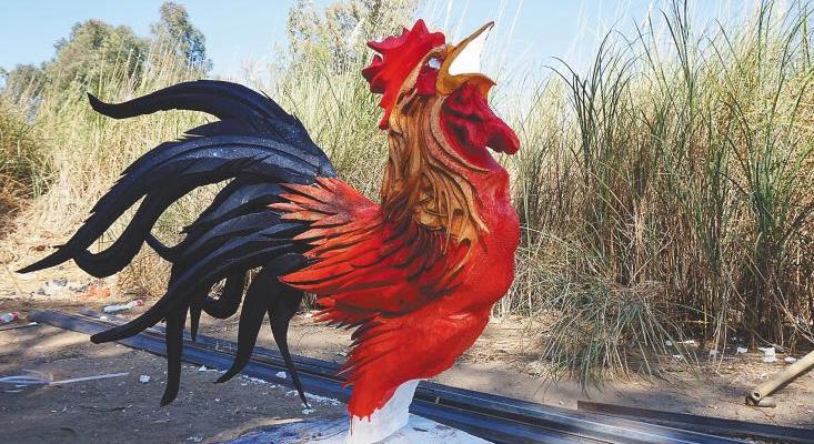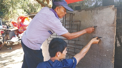 “今年西北坊制作花灯的主题是‘脱贫攻坚,发展养殖’,包括猪、鸡、牛等造型的花灯。” 邢诒辉自豪地说,在政府的帮扶下,当地不少村民发展养殖摘了“贫困帽”,这个主题很应景。说罢,邢诒辉和几名村民搬出他们即将完工的鸡花灯。这只“雄鸡”红冠高耸,身披彩衣,黑尾飘逸,威风凛凛,一副将要踱步而行的姿态,十分逼真,在场看客无不称赞。