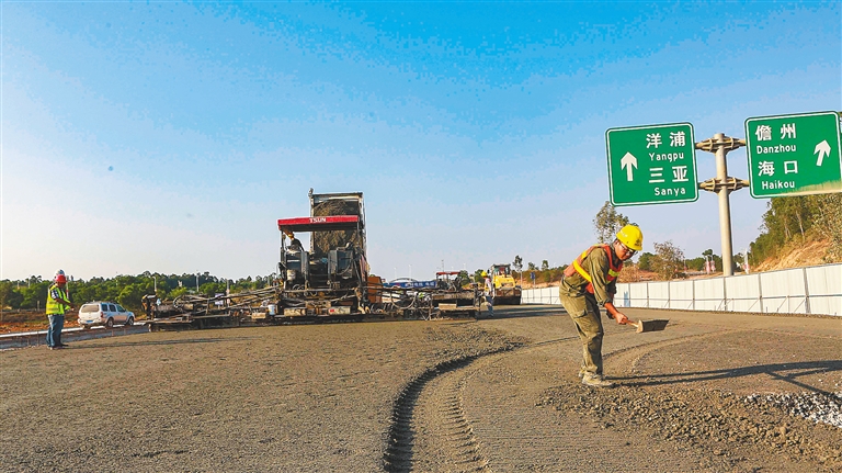 2月21日,在万洋高速与西线高速白马井互通连接处,施工人员正在铺设路面。目前,该项目路基工程完成99.14%,桥梁下部结构完成99.5%,部分路面已经开始铺设沥青。