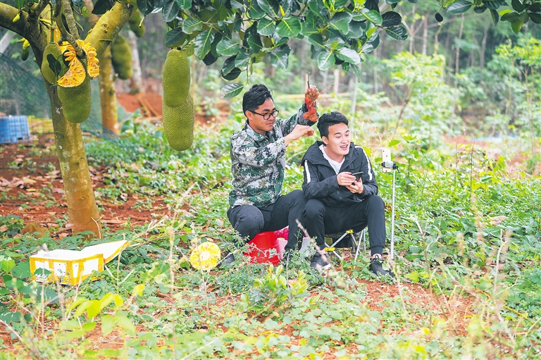 2月24日,文昌市东路镇,“90后”电商周华龙(左)和伙伴一起用网络直播的方式卖水果。据了解,在网络直播的帮助下,周华龙一年可以卖掉300万斤水果,年营业额达到2000多万元。2018年,文昌全市网络交易额达82.74亿元,全省排名第三,获评全国“电商示范百佳县”,是我省唯一入选的市县。本报记者 袁琛 摄