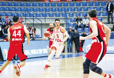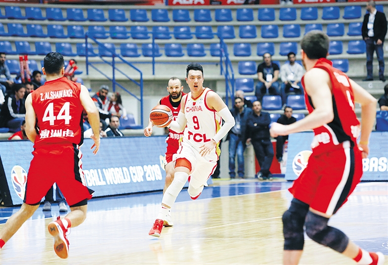 2月24日,在黎巴嫩举行的2019年国际篮联篮球世界杯亚洲区预选赛中,中国队以90:59战胜叙利亚队。图为中国队球员翟晓川(右二)在比赛中带球突破。 新华社发