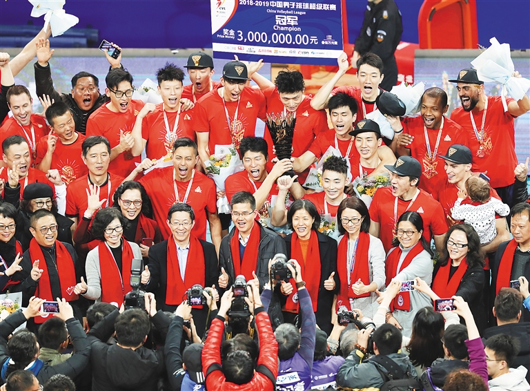 2月27日,在2018-2019赛季中国男子排球超级联赛总决赛第三场比赛中,上海金色年华队主场以3:0战胜北京汽车队。最终,上海金色年华队以3:0的总比分战胜北京汽车队,夺得联赛冠军。图为上海队在颁奖仪式上庆祝夺冠。