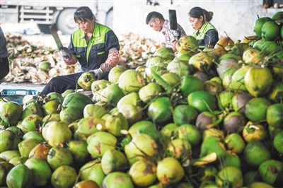在文昌市椰子大观园附近,“东郊宝椰”加工厂的工人十分忙碌。尽管厂里50多名工人全员上岗,每天加工万余个天然椰青,但产品销售仍供不应求。