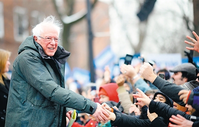 3月2日,在美国纽约,美国联邦参议员伯尼·桑德斯与支持者握手。