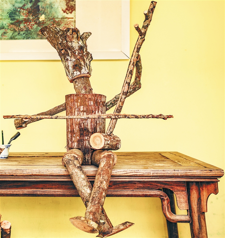 店面不大,却装满了艺术家的各种奇思怪想。在《话·未来》这组作品中,几位“木头兄弟”摆出多种姿势:拉二胡、倒茶、射箭等,旁边还有一把留给观众的木椅。这是一组有趣的互动作品,一边是进行激烈“战争”的场景,另一边展现出“品茶、欣赏音乐”的悠闲格调,透过稀奇怪异的木头形态,仿佛能激发人们对未来的思考。