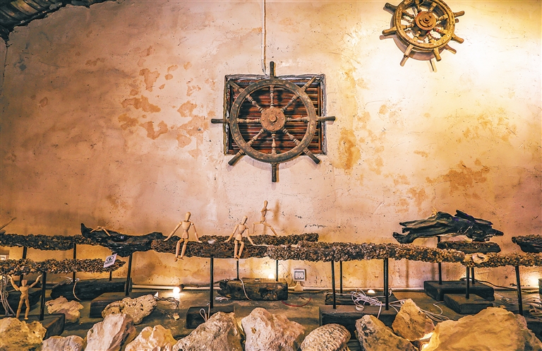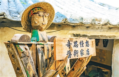 刷成蔚蓝色的老旧珊瑚石墙,充满年代感的瓦顶和梁架,三亚市天涯区西岛渔村市场路55号,正是海南日报记者此行的目的地。穿过木门,迎接我们的是一位炫酷的木头人,它头戴草帽,“身体”和“四肢”由长短不一、形态各异的木板装钉组成,“双手”托举一块阴刻店名的木牌——“奇思怪想艺术家店”。