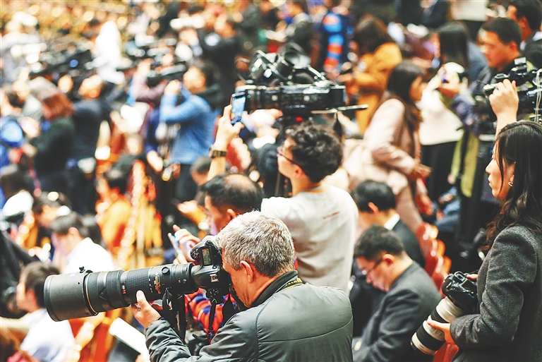 3月3日下午,中国人民政治协商会议第十三届全国委员会第二次会议在北京人民大会堂开幕。图为聚焦两会盛况的中外媒体记者。据悉,目前已有3000多名中外记者报名采访全国两会。本报特派记者 张茂 摄