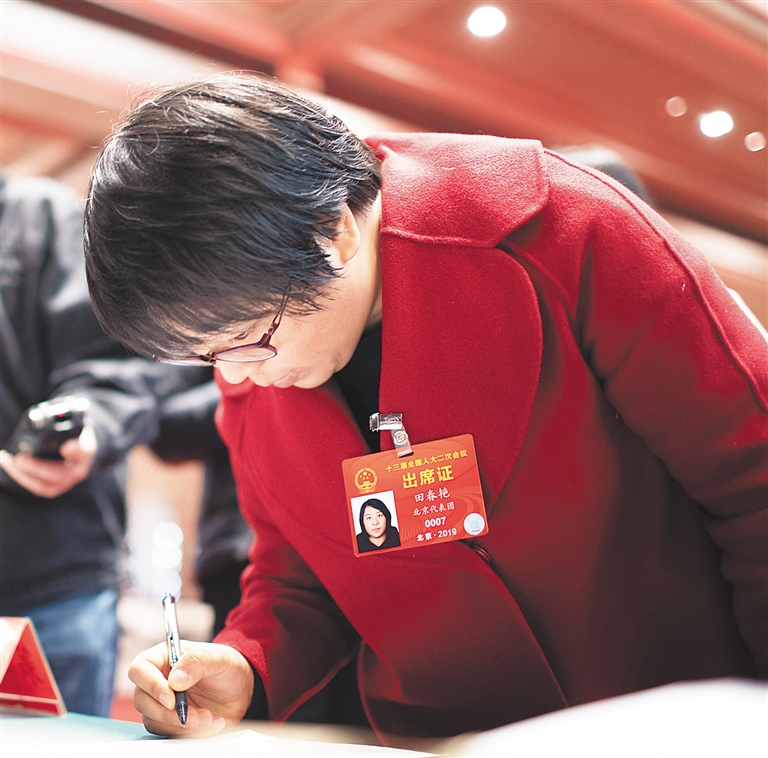 3月3日,北京代表团的全国人大代表田春艳在北京会议中心签到并领取会议材料。