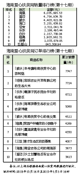 记者通过公布的榜单看到,截至3月3日16时,海南农垦以603.59万元的销售额又一次摘下了销售冠军,澄迈与陵水分别以475.49万元、440.36万元的销售额居第二、第三名。在当天公布的海南爱心扶贫网第十七期的订单排行榜上,陵水本号镇电商扶贫中心的扶贫茶树菇、琼海忠锐农业开发公司的生态大米、乐东春源子民农民合作社的扶贫哈密瓜依然占据订单排行榜前三名的位置。
