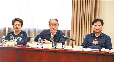 3月5日下午,全国政协十三届二次会议举行小组会议,住琼全国政协委员康耀红(中)参与讨论政府工作报告。 本报特派记者 张茂 摄