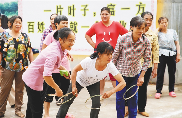 当日下午,该农庄为迎接“三八”妇女节,组织40多名贫困户采茶女工开展拔河比赛和“盲人敲锣”等活动。