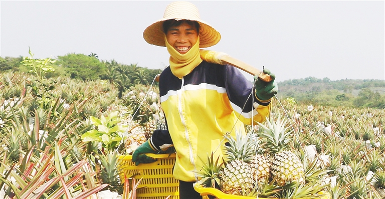 为了做好菠萝采摘管理,海南天地东昌生态农业股份有限公司投入80多万元,在菠萝基地建造起约900平方米的菠萝存储厂房和安装生产线,由人工对菠萝产品进行分拣,分大中小果三个等级包装处理。图为工人在采摘菠萝。