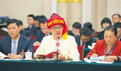 3月10日,参加十三届全国人大二次会议的海南代表团召开会议,审议外商投资法草案。图为朱洪武代表(中)发言。 本报特派记者 王凯 摄