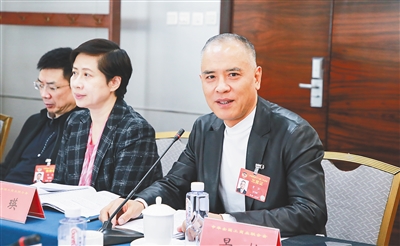 3月7日,全国政协十三届二次会议进行小组会议,讨论计划报告和预算报告。图为住琼全国政协委员景柱(右)在小组会议发言。 本报特派记者 张茂 摄