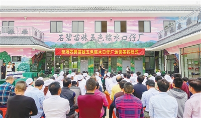 据介绍,石碧苗妹五色粽厂是政企合作传承民族文化的公益产业扶贫项目,由碧桂园海南区域捐赠近800万元建设新厂房和升级生产设备,项目于2017年10月18日开工建设。2018年1月16日,在石壁镇委、镇政府指导下,成立琼海石碧五色粽农民专业合作社,以“党支部+合作社+贫困户”模式培育特色主导产业,负责粽子厂日常运营管理。